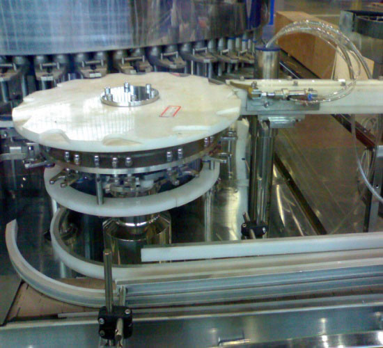 Después de la soladura de tapado, las botellas son enviadas al canal de descarga a través de una rueda de estrella. Cuando el manipulador se abre, el canal de descarga quitará las botellas.