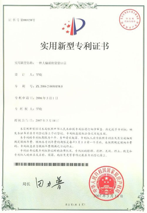 Certificado de patente para la tapa de bolsa flexible no PVC de solución IV emitido por la Oficina Nacional de Propiedad Intelectual de China